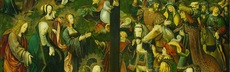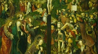 Het tweede deel van de passie begint met de ondervraging door Caiaphas van twee getuigen. Jezus wordt ter dood veroordeeld. Petrus wordt driemaal gevraagd of hij bij Jezus hoort, maar verloochent hem driemaal (5). Jezus wordt naar Pontius Pilates gebracht. Judas pleegt zelfmoord uit wroeging. Pilates is geneigd Jezus de vrijlating te schenken, maar het volk kiest ervoor in de plek daarvan de schurk Barrabas vrij te laten. Pilates wast zijn handen in onschuld (6). Simon van Cyrene draagt Jezus’ kruis. Op Golgotha wordt Jezus beschimpt door het volk en gekruisigd. Hij sterft. (7). Het gordijn van de tempel scheurt en de aarde beeft. Jozef van Arimathea vraagt Pilates om Jezus’ lichaam vrij te geven en begraaft hem. (8).